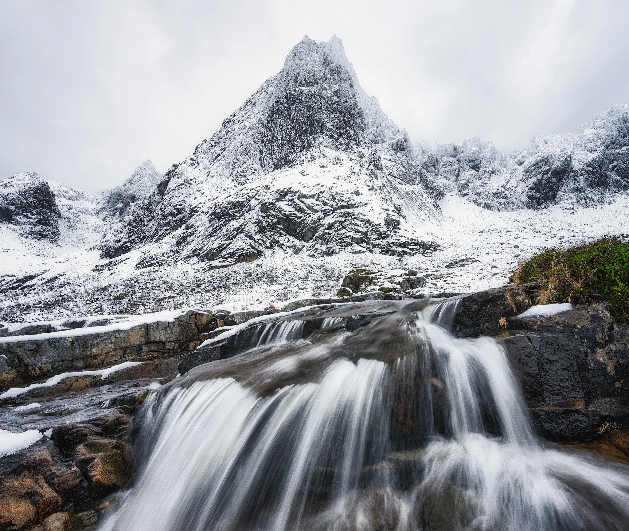 Mountain landscape with snowy peaks in the background, a sunset sky, and water flowing over rocks in the foreground.