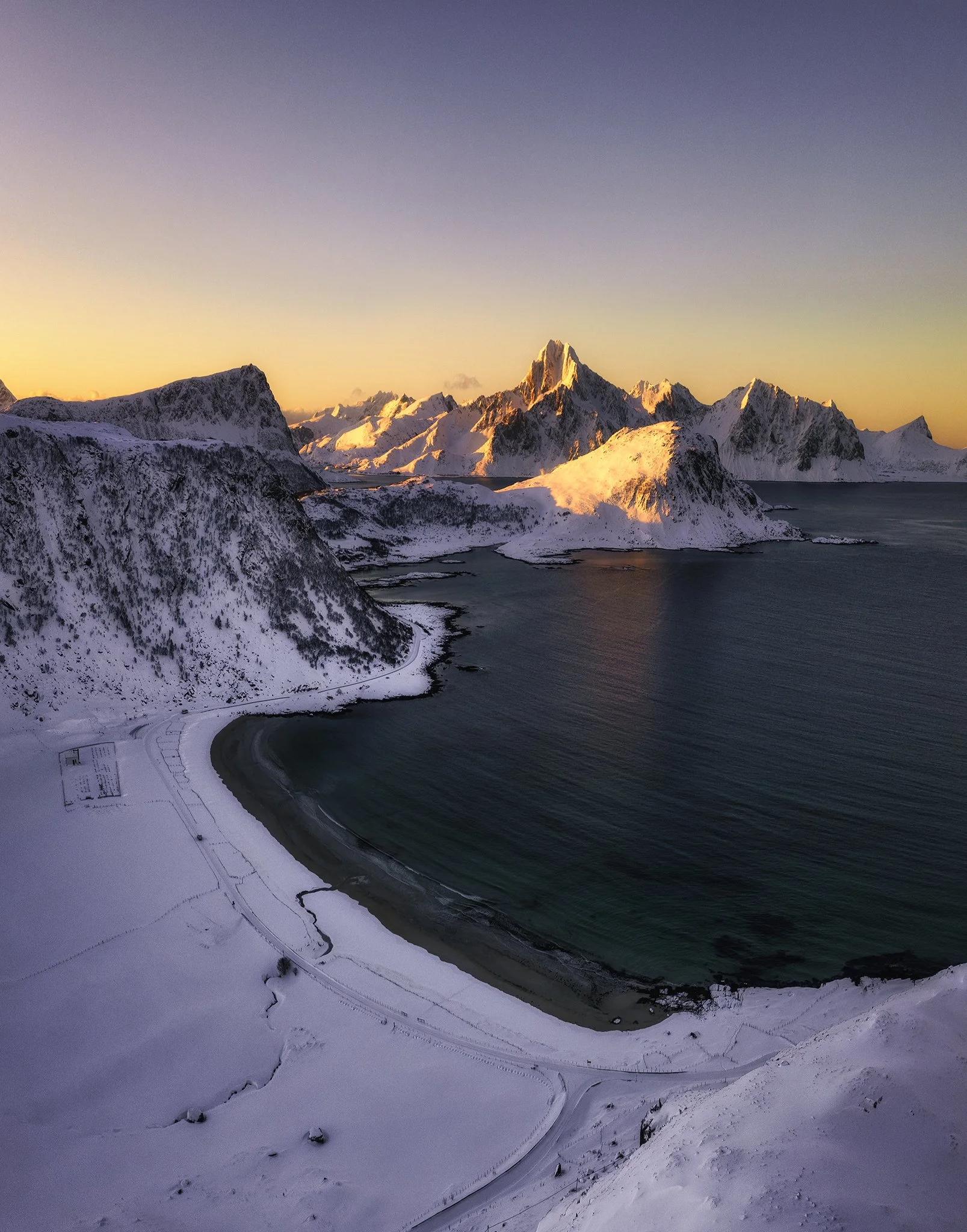 Snow-covered mountains and coastline during sunset with a small, curved beach and calm ocean water.