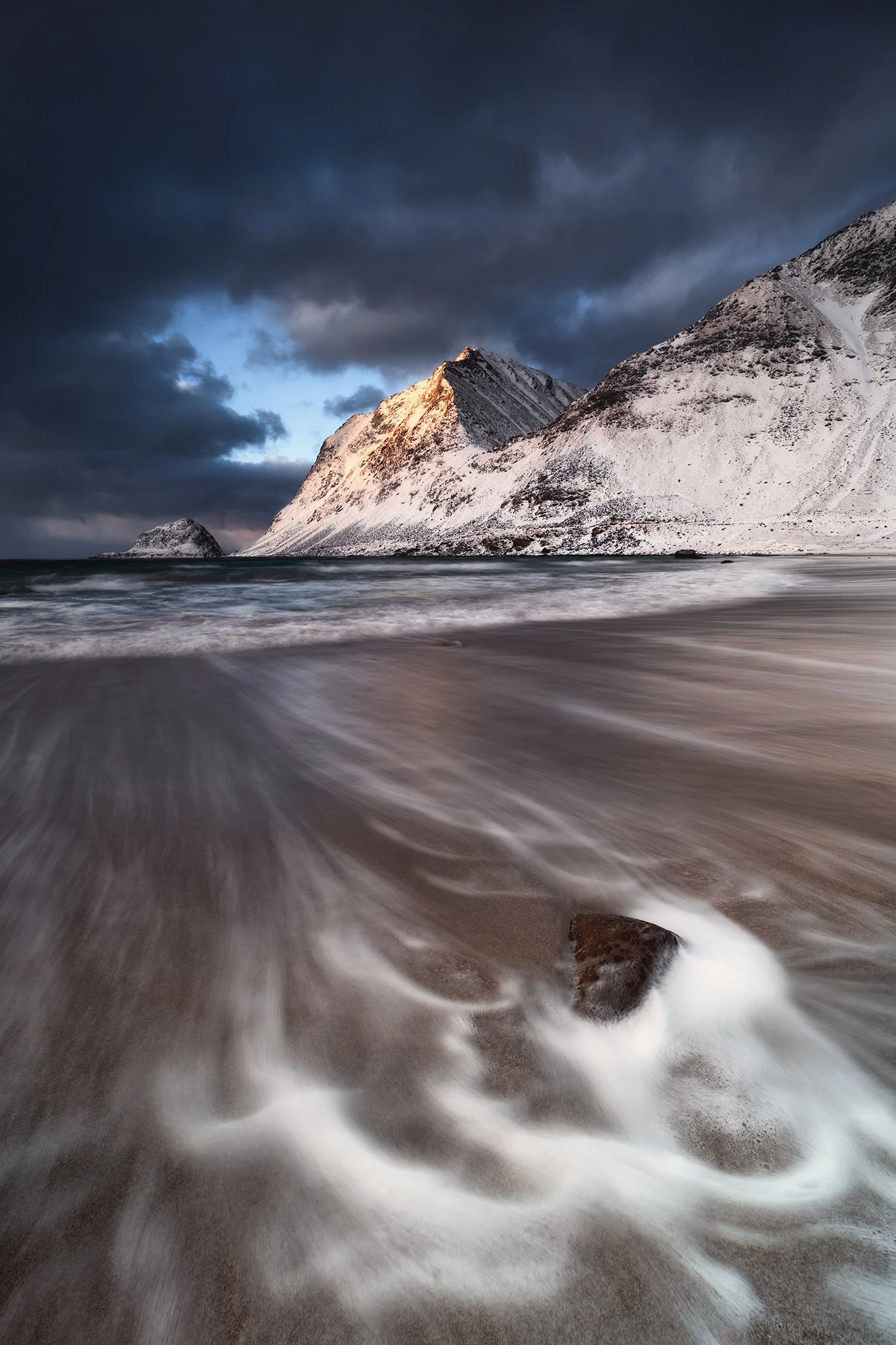 Snow-capped mountains overlooking a beach with turbulent waters and a dark, cloudy sky.