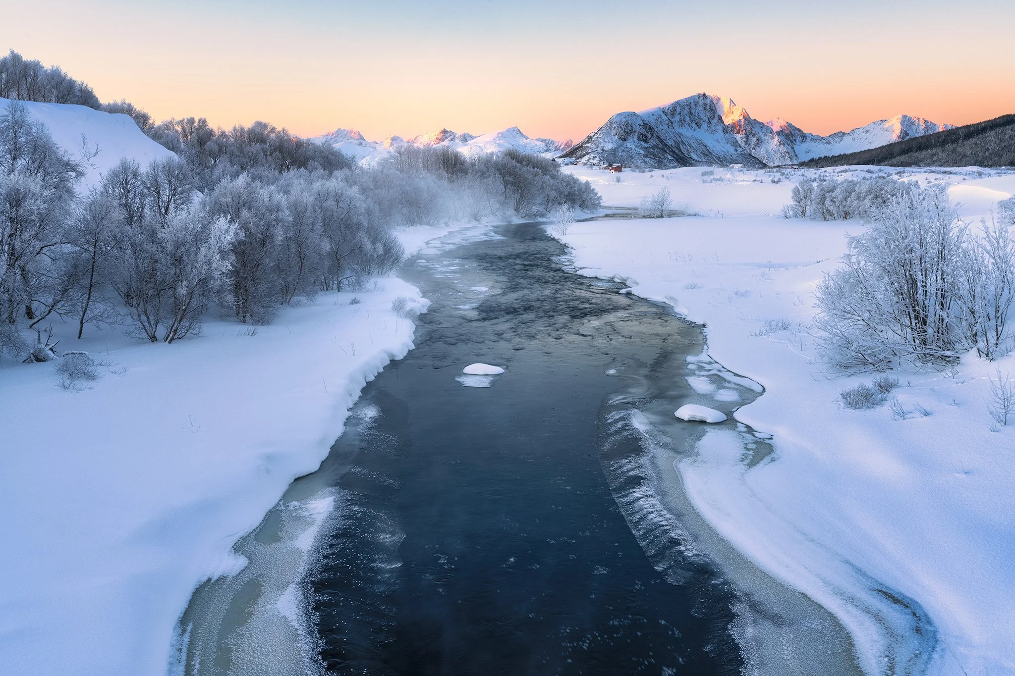 A snowy landscape with a partially frozen river winding through snow-covered trees and mountains at sunset.
