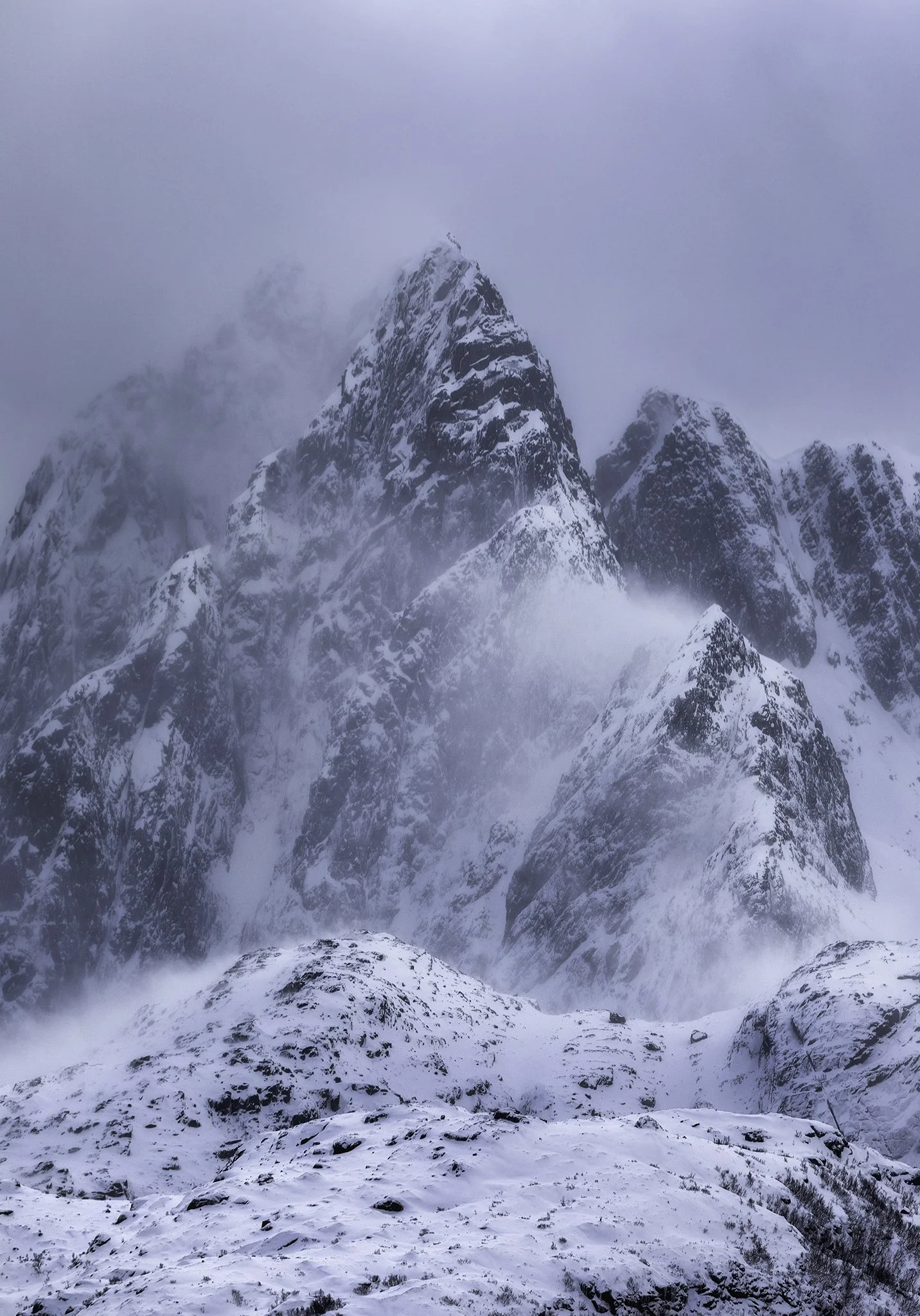 Snow-covered mountain peaks shrouded in mist and clouds.